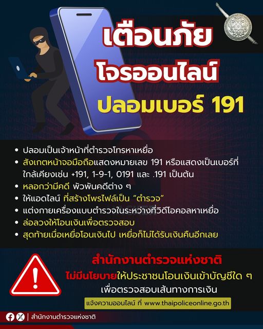สภ.เมืองศรีสะเกษ เตือนภัยออนไลน์มีคนร้ายปลอมเลขหมาย 191 โทรข่มขู่เรียกเงิน ทางสำนักงานตำรวจแห่งชาติจ